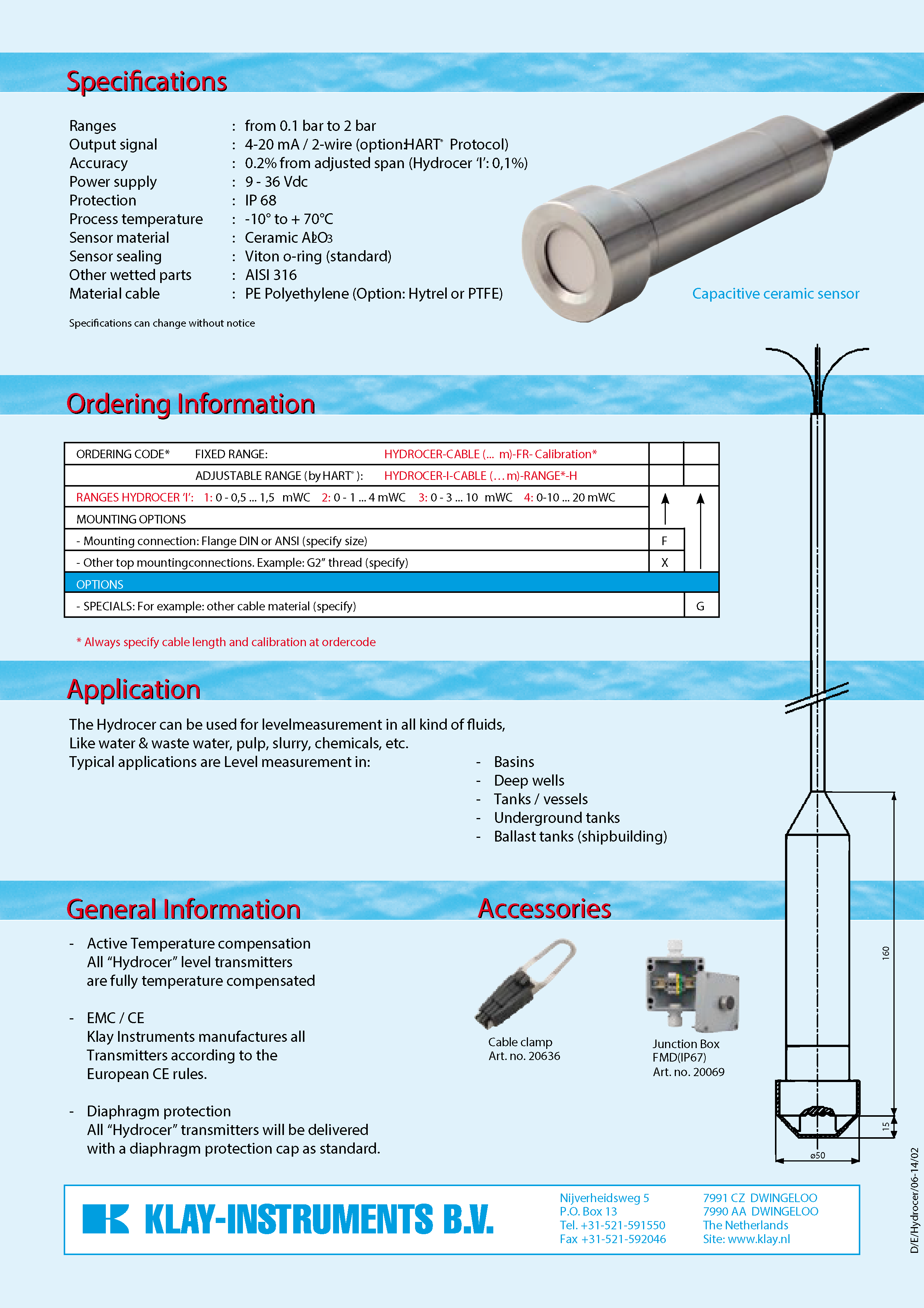 The Hydrocer is a level transmitter with cable or tube extension. Application for level measurement of water, wastewater and sludge. Level measurement of drinking water, surface water, wastewater and sludge. Often used by water boards and water works. Various industrial applications like level measurement in storage tanks. Level measurement of ballast water, drinking water and oil on ships.