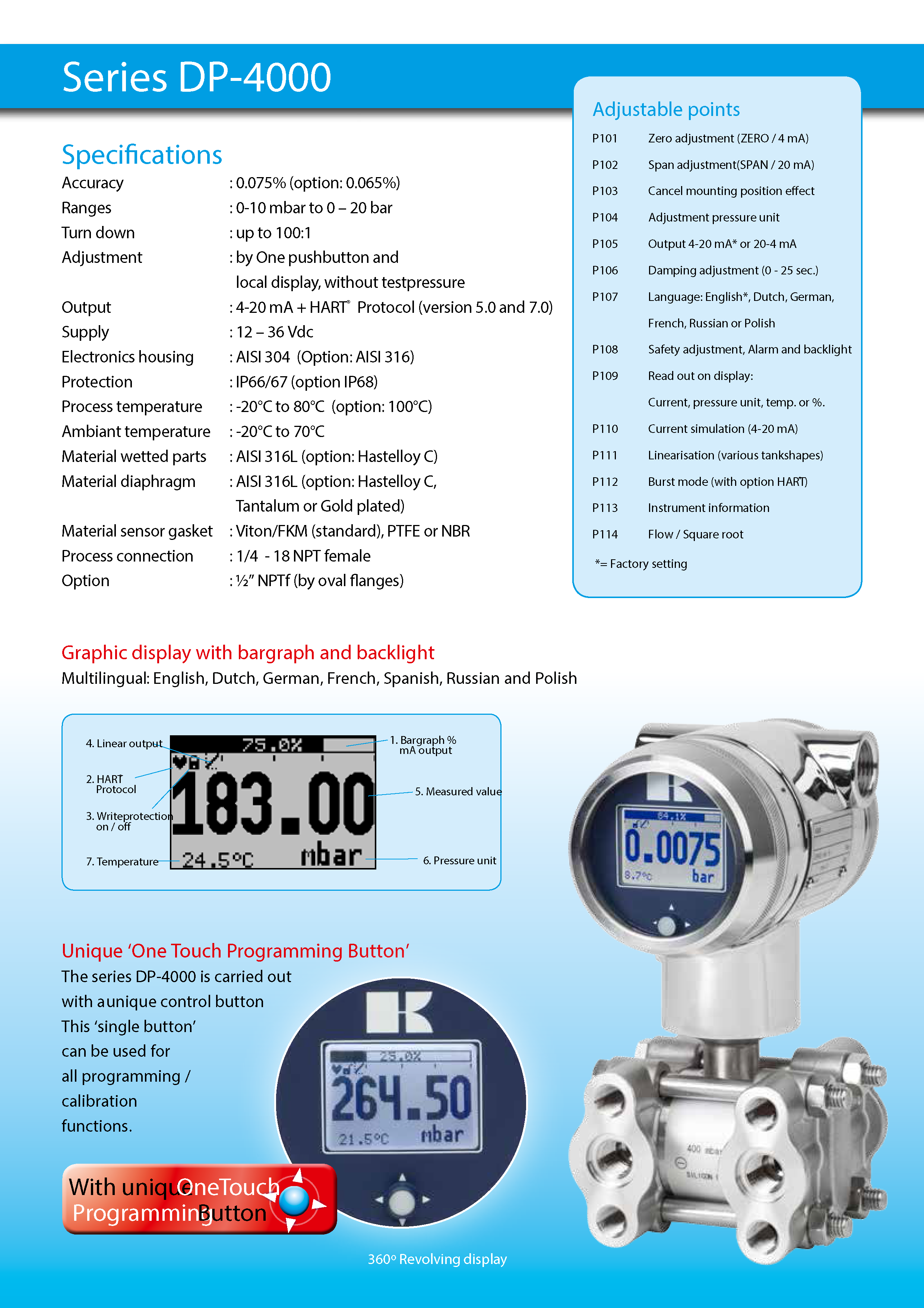 The DP-4000 is an advanced differential pressure transmitters with a compact and robust stainless steel housing. This microprocessor based transmitter can easily be programmed using the unique programming button and display.