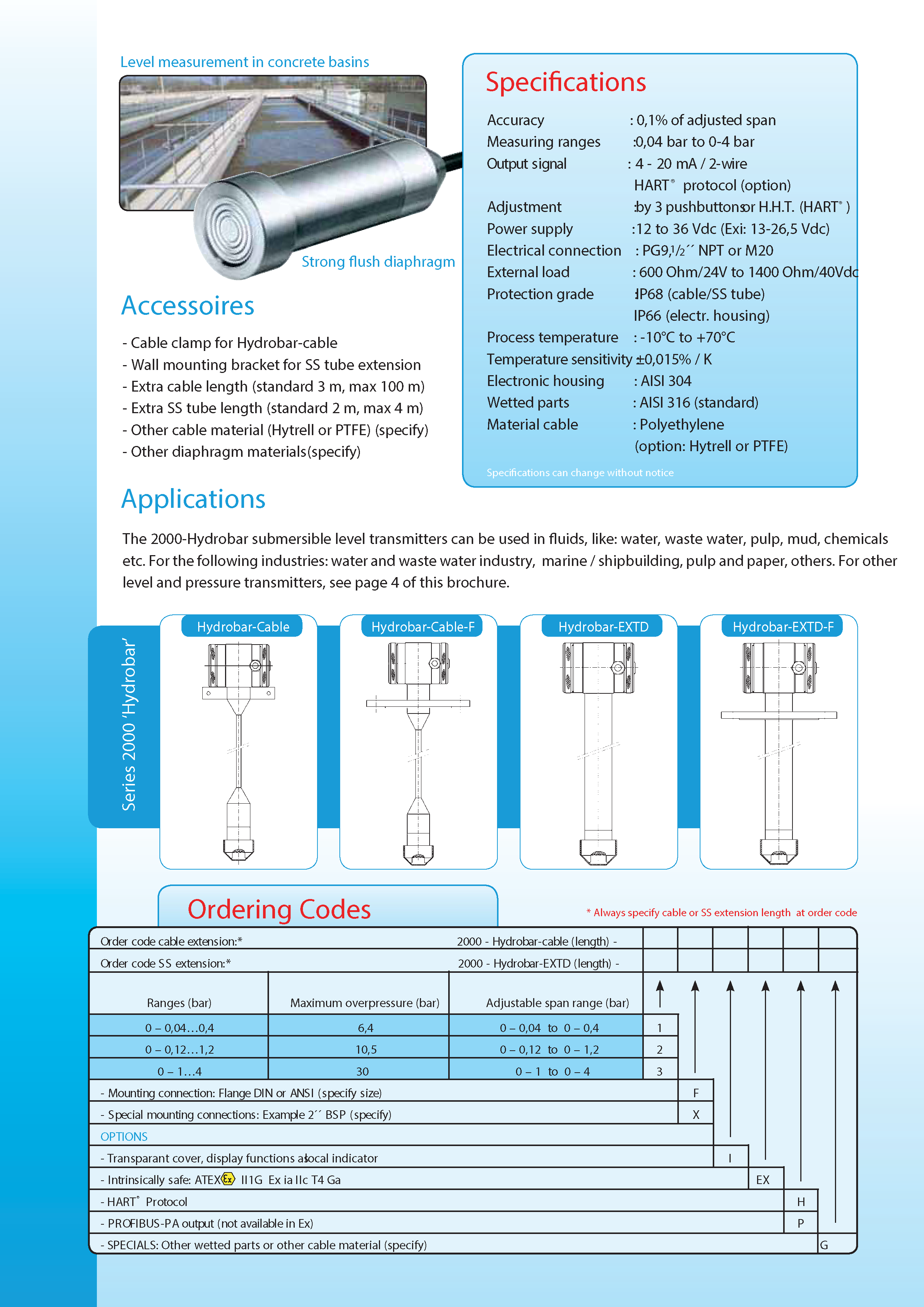 The Hydrobar-S is a microprocessor based level transmitter with cable or tube extension. Application for level measurement of water, wastewater and sludge. This transmitter can easily be programmed with three push buttons and display. Level measurement of drinking water, surface water, wastewater and sludge. Often used by water boards and water works. Various industrial applications like level measurement in storage tanks. Level measurement of ballast water, drinking water and oil on ships.