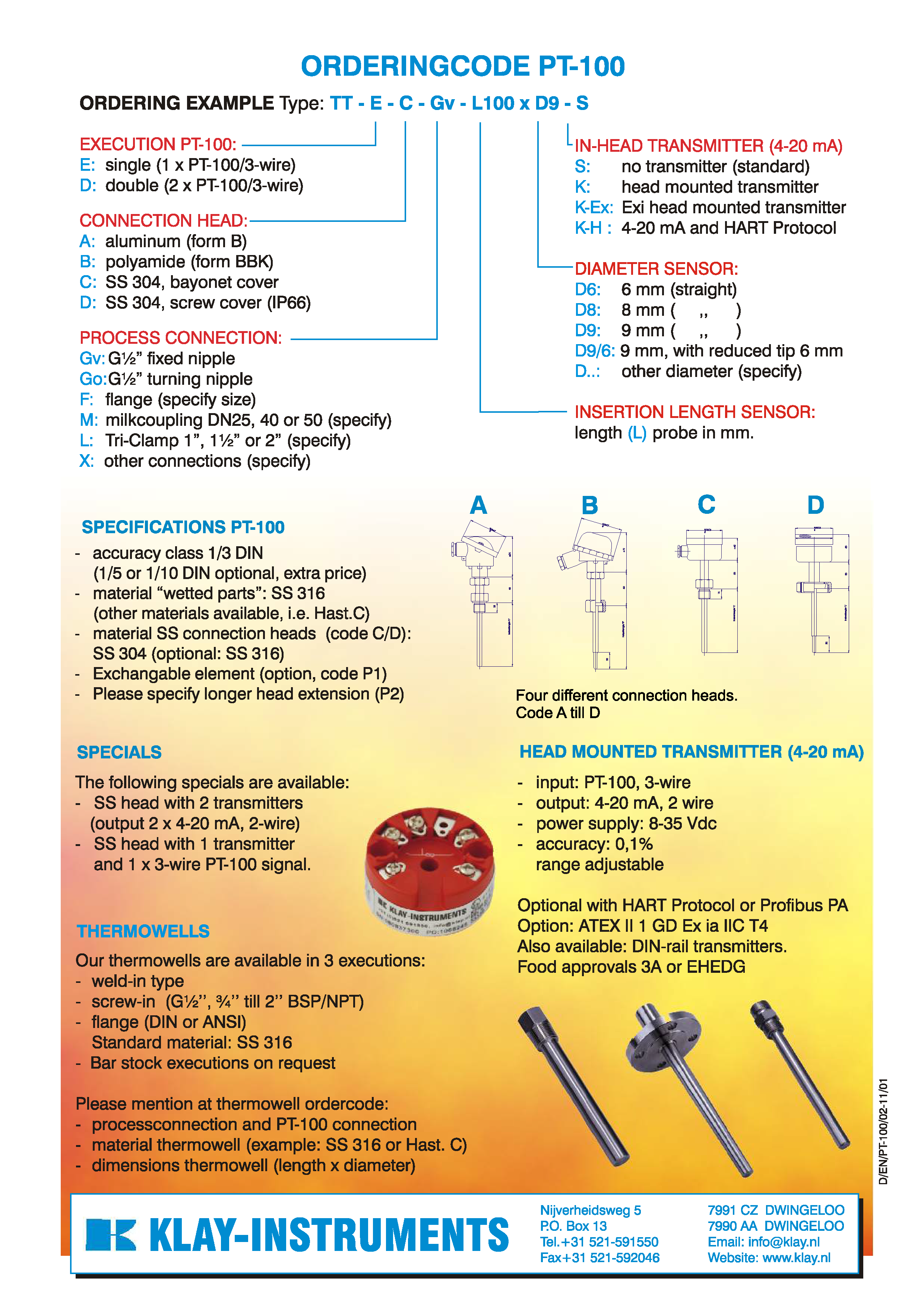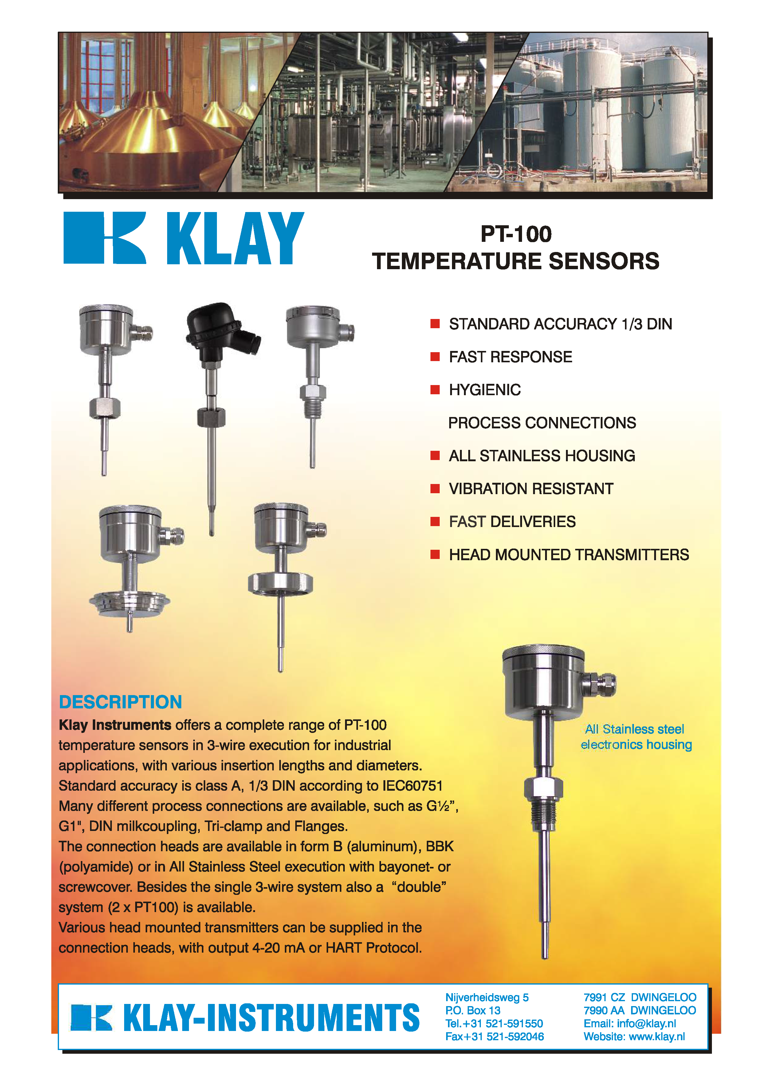Temperature sensors for all industrial applications. Stainless steel housing with bajonet or screw cover. Various process connections, also hygienic connections. Production according to customer specifications. Temperature measurement in tanks or conduits and also in rooms and ovens.
